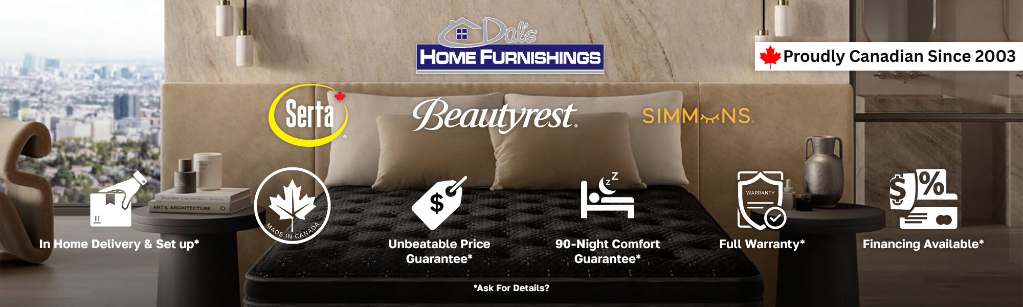 Shop MattressesDal's Home Furnishings located in Brantford, ON specializes in Custom Canadian-made furniture. We carry quality furniture from reputable Canadian manufacturers including Decor-Rest, Brentwood, Amisco, and Bermex.