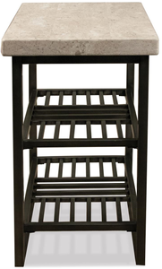 Constructed of a Travertine stone top with metal posts and framework. Fixed center and bottom shelf made of tubular metal slats.Read More