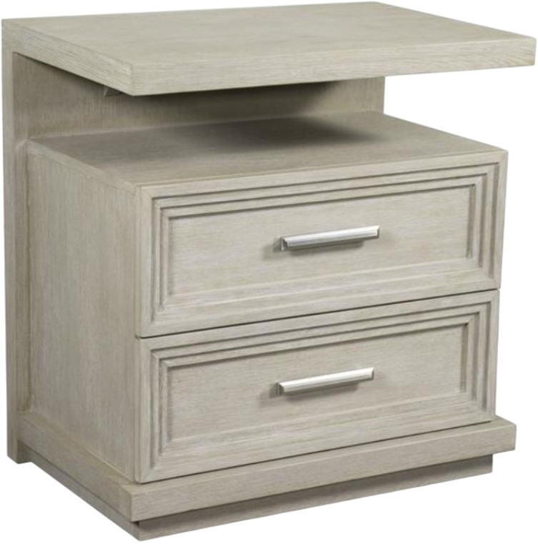 Cascade offers a fresh look with detailed shapes and refined styling. Inspired by the trend of modern coastal interior design directions, the collection makes it easy to bring home the feeling of vacation with a light and breezy style. A minimalistic approach and modern sleekness convey the collection's relaxed attitude. Floating plinth bases give the group a light and airy feel while a stepped-down border on drawer faces provides a cascading effect and architectural detail. Clean, fresh color palette: a soothing tone of Dovetail create a modern, relaxed feel. Subtle wire brushing adds a textural element. Brushed nickel bar pulls add a touch of shimmer to its naturally soothing palette.