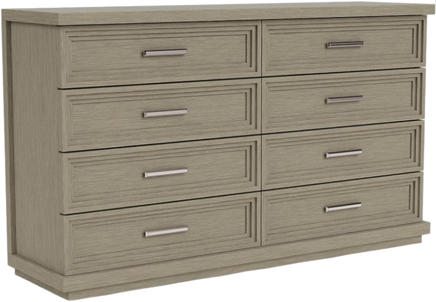 Cascade offers a fresh look with detailed shapes and refined styling. Inspired by the trend of modern coastal interior design directions, the collection makes it easy to bring home the feeling of vacation with a light and breezy style. A minimalistic approach and modern sleekness convey the collection's relaxed attitude. Floating plinth bases give the group a light and airy feel while a stepped-down border on drawer faces provides a cascading effect and architectural detail. Clean, fresh color palette: a soothing tone of Dovetail create a modern, relaxed feel. Subtle wire brushing adds a textural element. Brushed nickel bar pulls add a touch of shimmer to its naturally soothing palette.