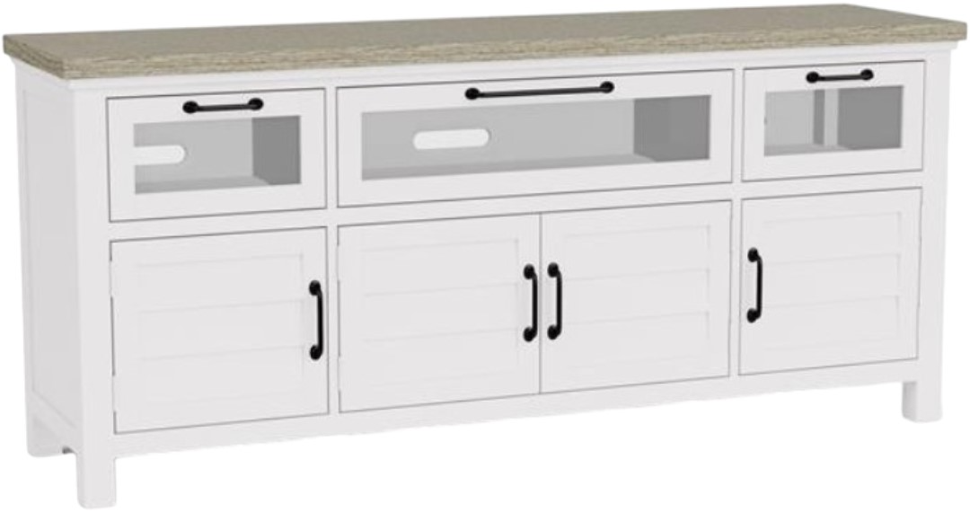 The Riverside Furniture Cora Entertainment Console showcases a Cloud base finish with a Fog finish top, creating a harmonious blend of colors. This console provides a stylish and functional solution for your entertainment needs, offering both storage space and a sleek surface for your devices.Read More