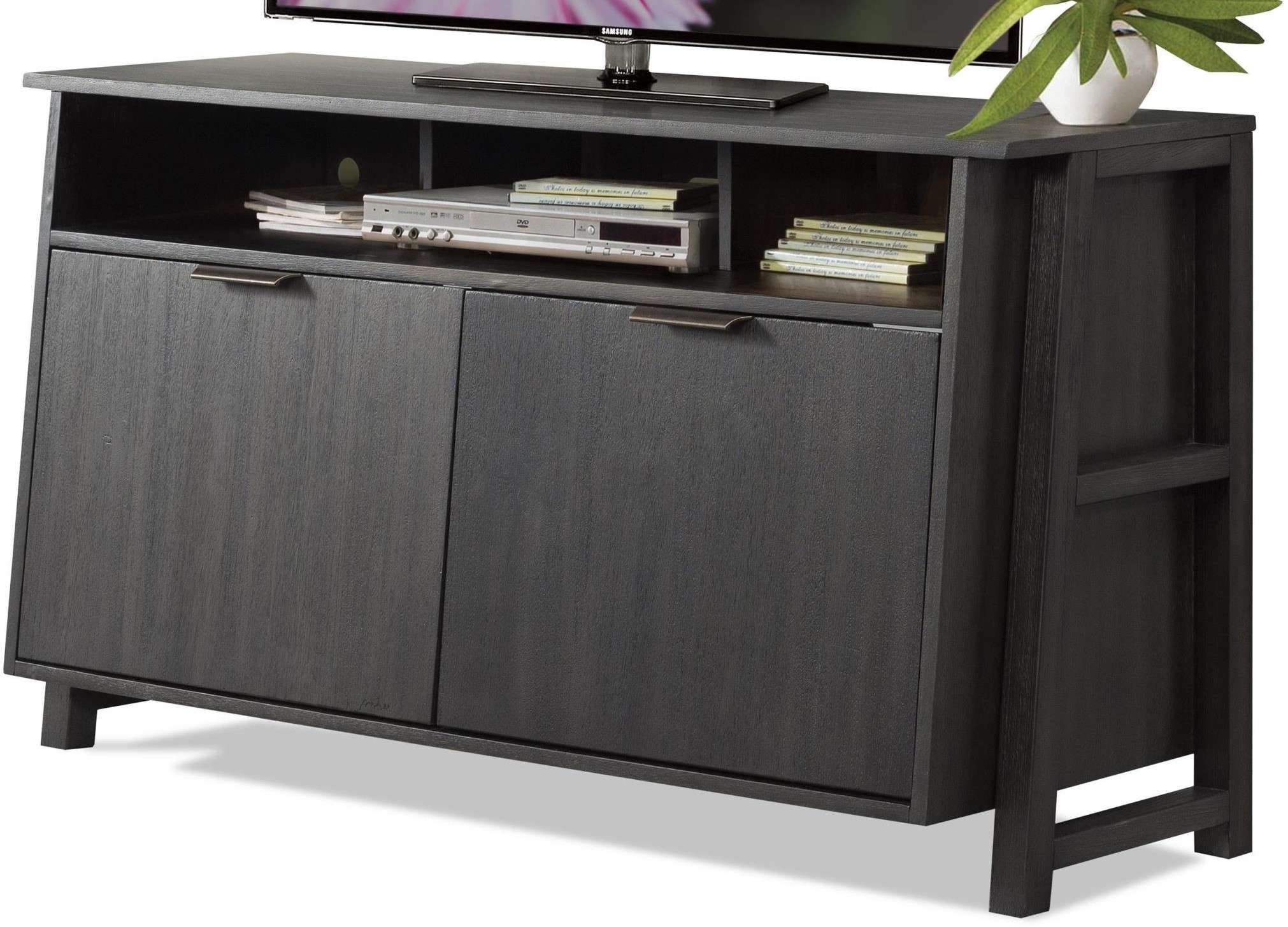 Constructed of Acacia solid and Acacia veneer. Three top open electronic storage areas.Two bottom doors each enclose an adjustable shelf.Read More